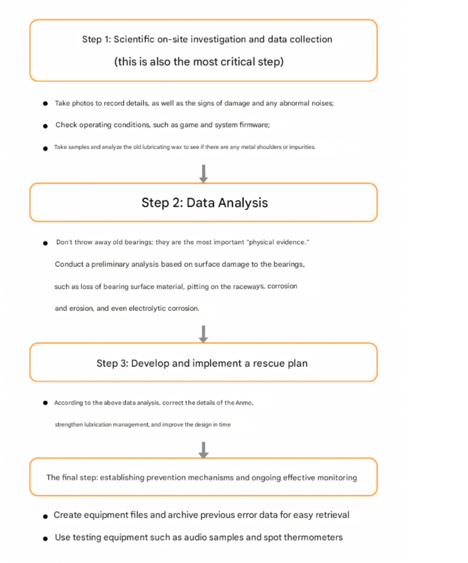 The first step is a scientific on-site investigation and data collection (this is also the most critical step): Take photos to record details, including the signs of damage and abnormal noise; check operating conditions, such as clearance and basic firmware; and take samples and analyze the old bearings. Check the grease for metal shavings and impurities.